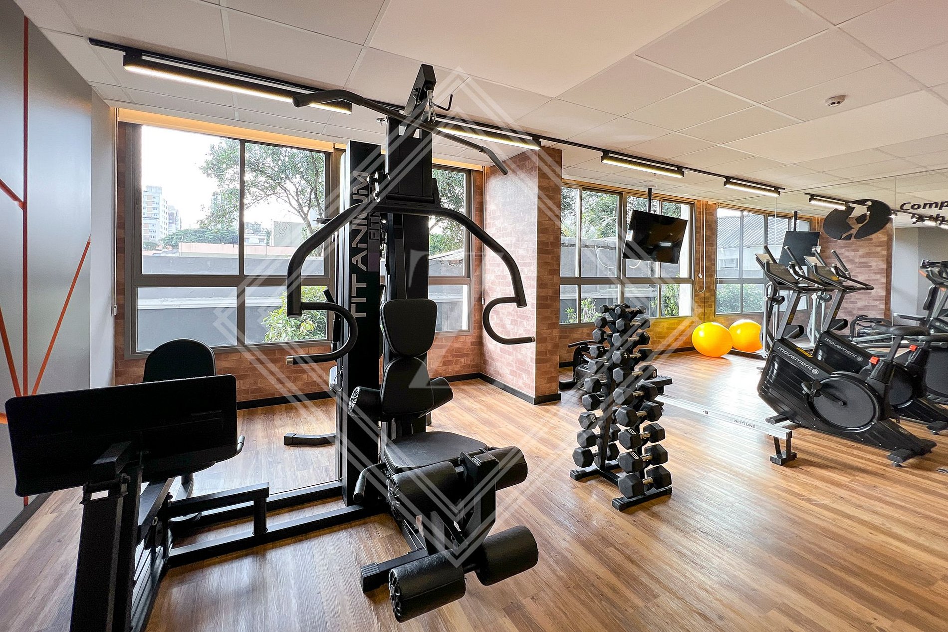 - Academia moderna com equipamentos de ginástica.