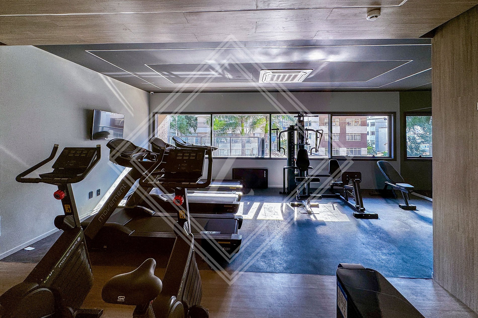- Academia moderna com equipamentos de ginástica.