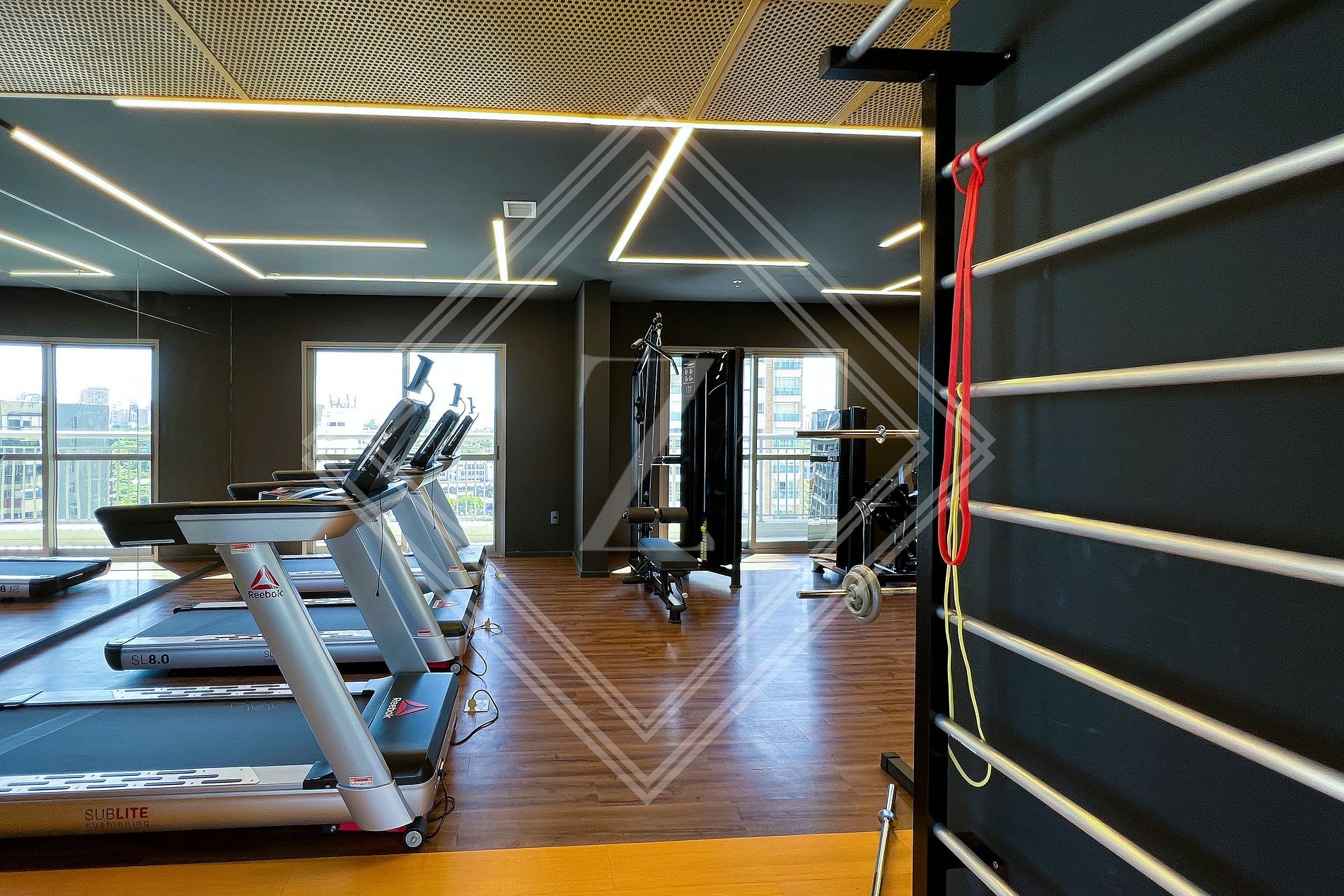 - Academia moderna com equipamentos de ginástica.