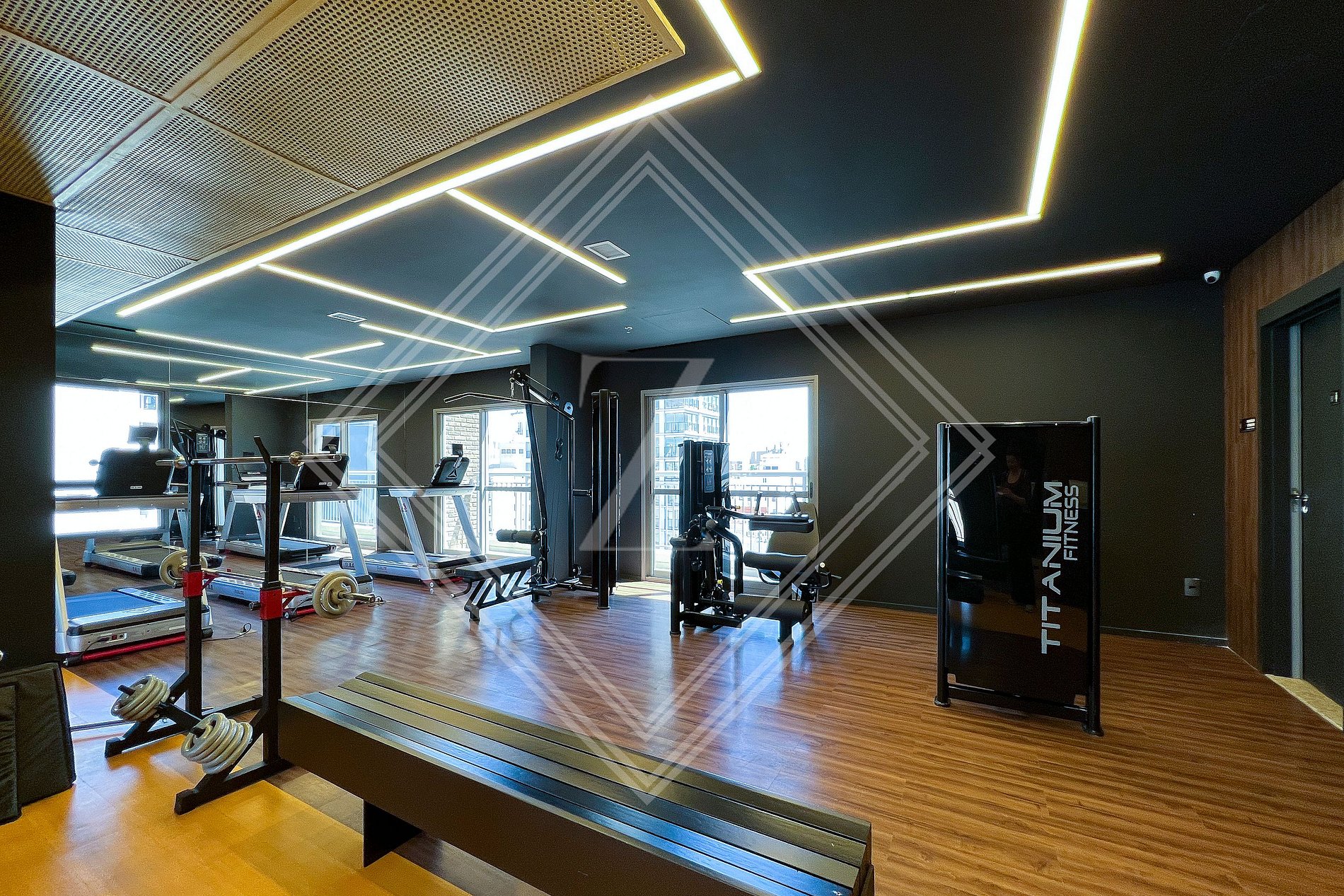 - Academia moderna com equipamentos de ginástica.