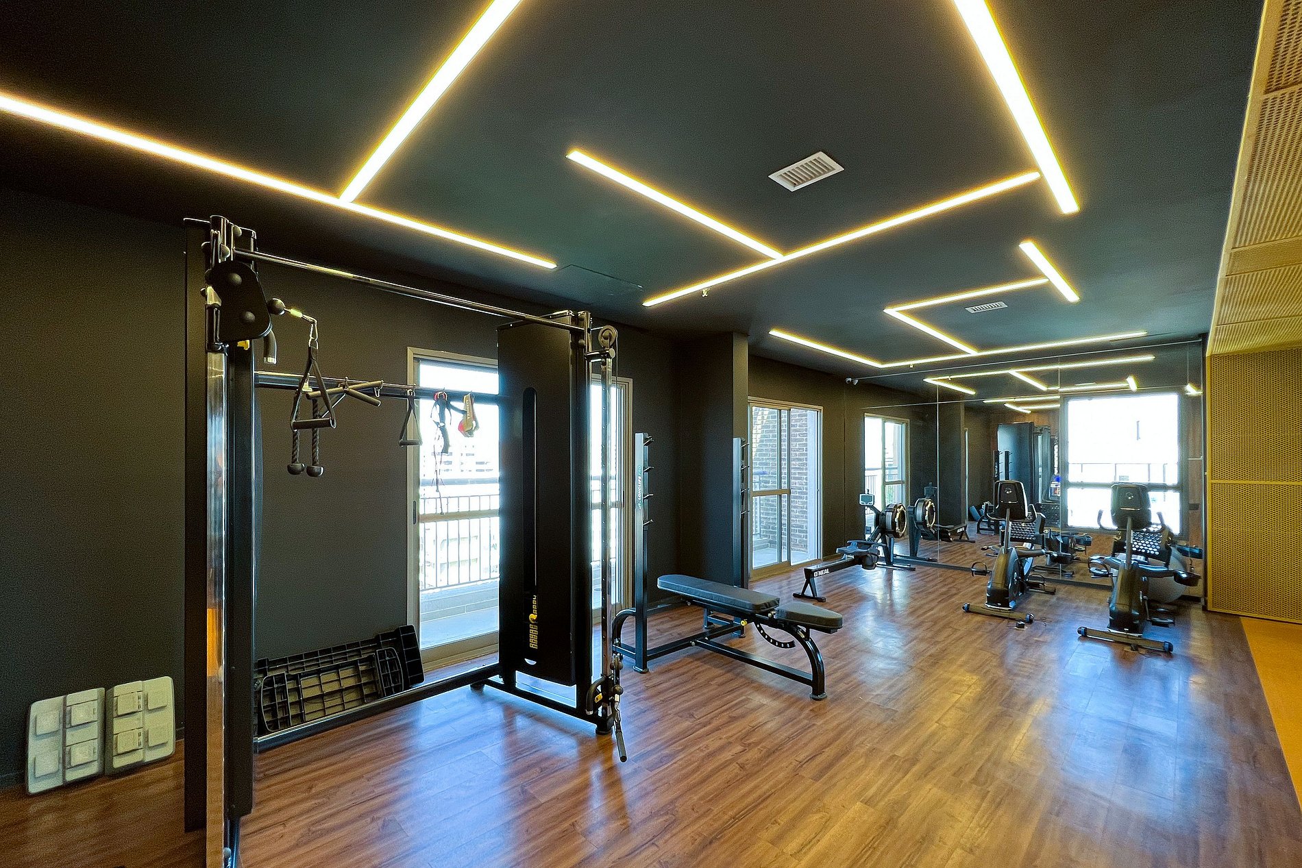 - Academia moderna com equipamentos de ginástica.