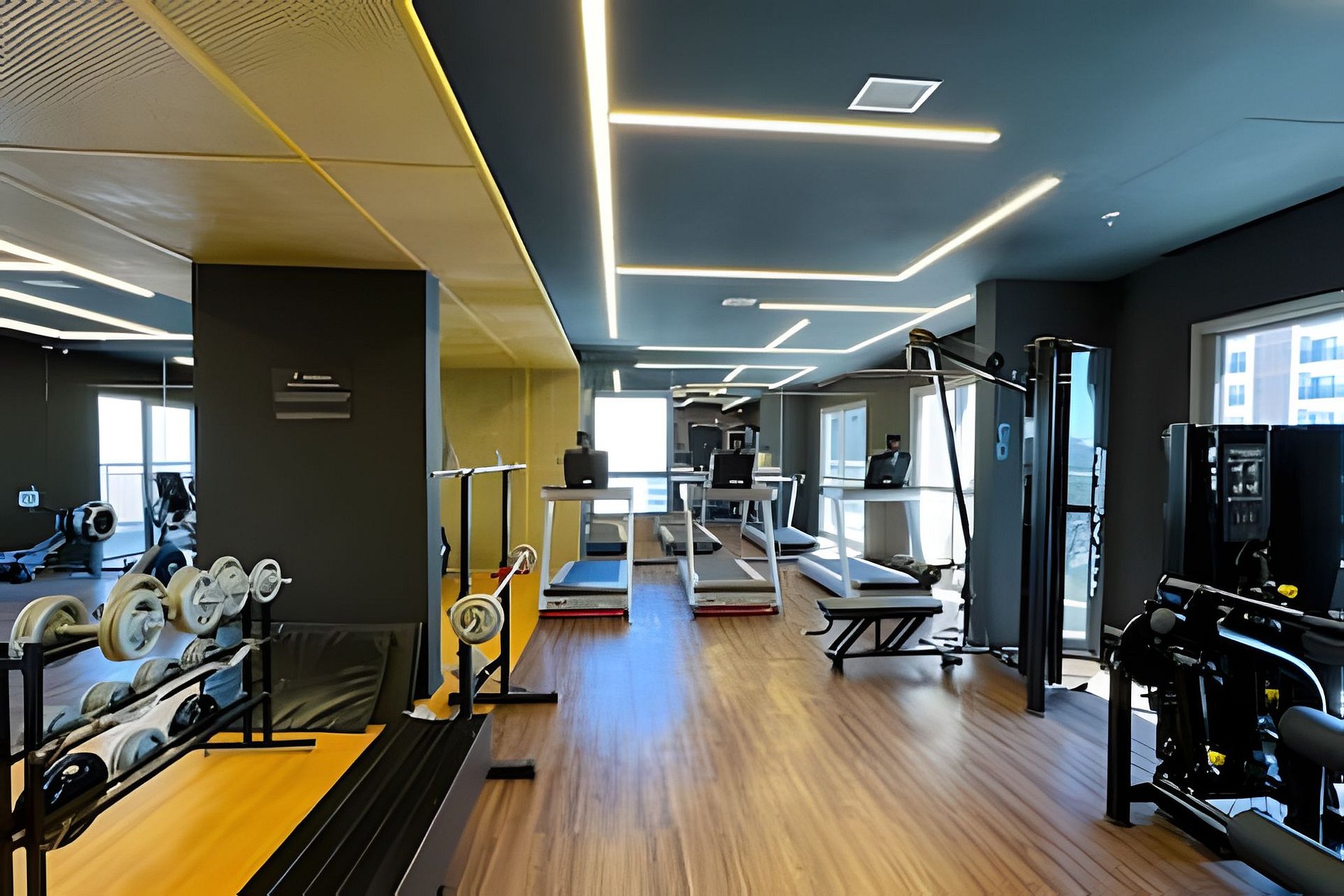 - Academia moderna com equipamentos de ginástica.