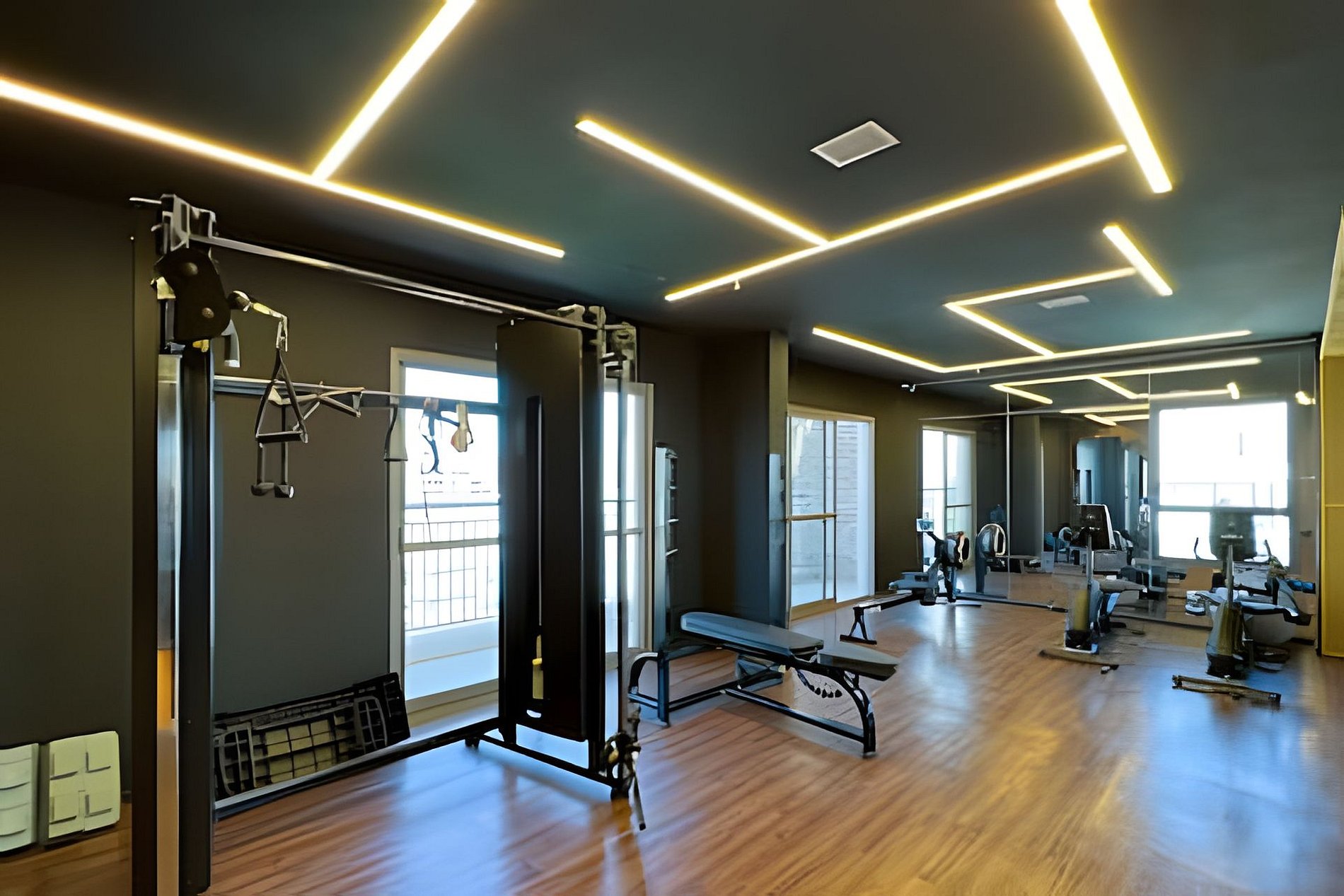 - Academia moderna com equipamentos de ginástica.
