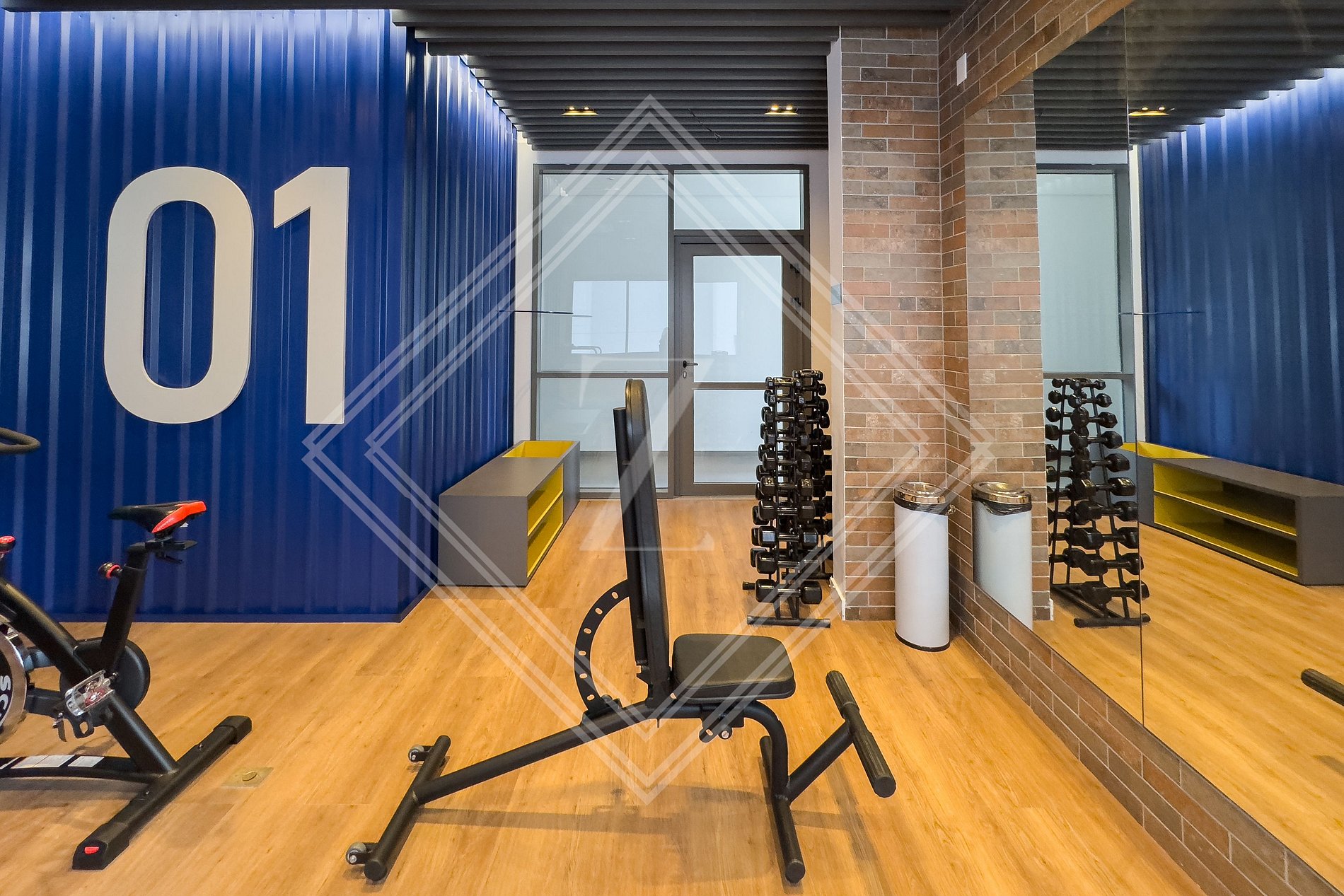 - Academia moderna com equipamentos de ginástica.