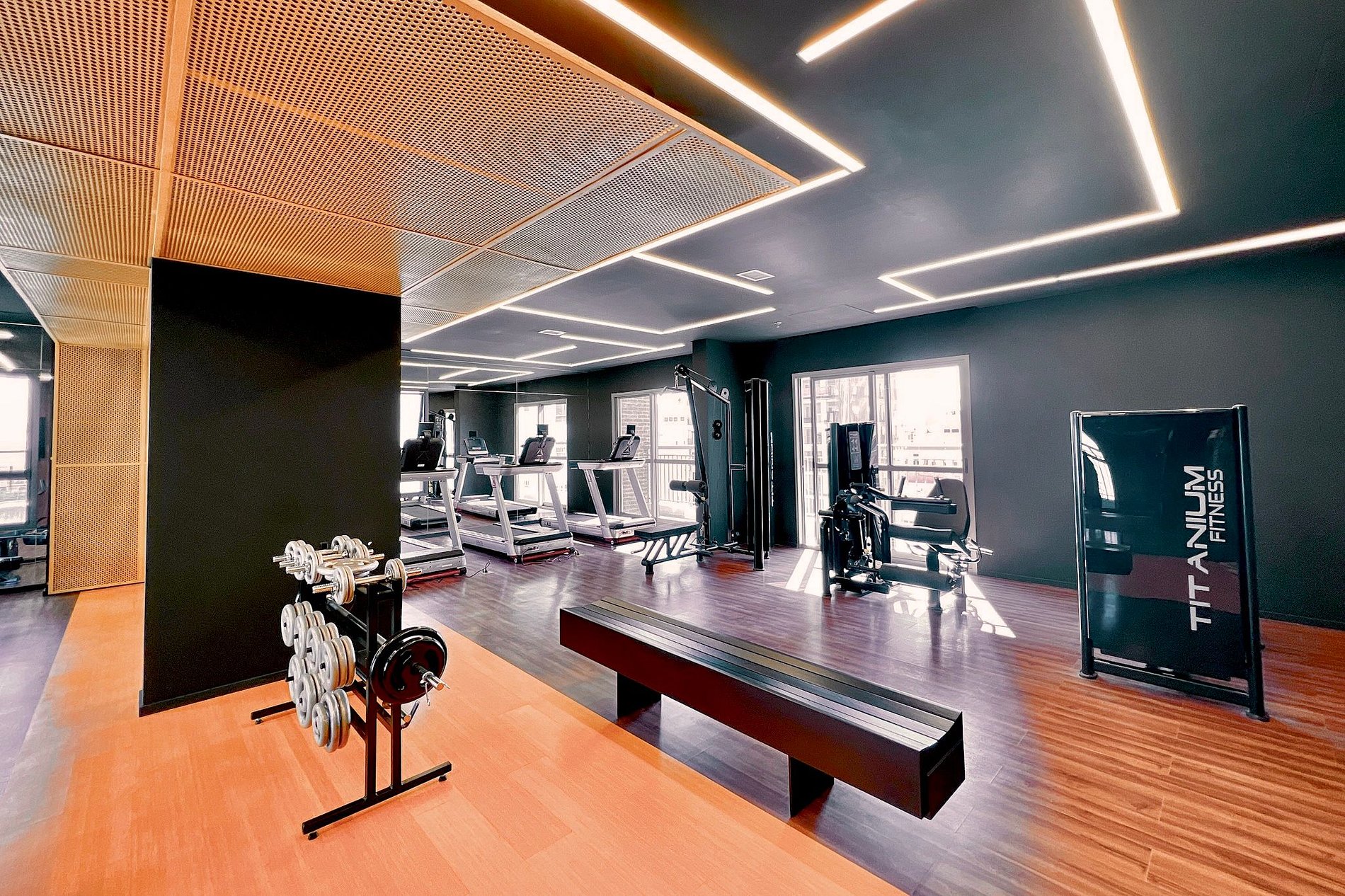 - Academia moderna com equipamentos de ginástica.