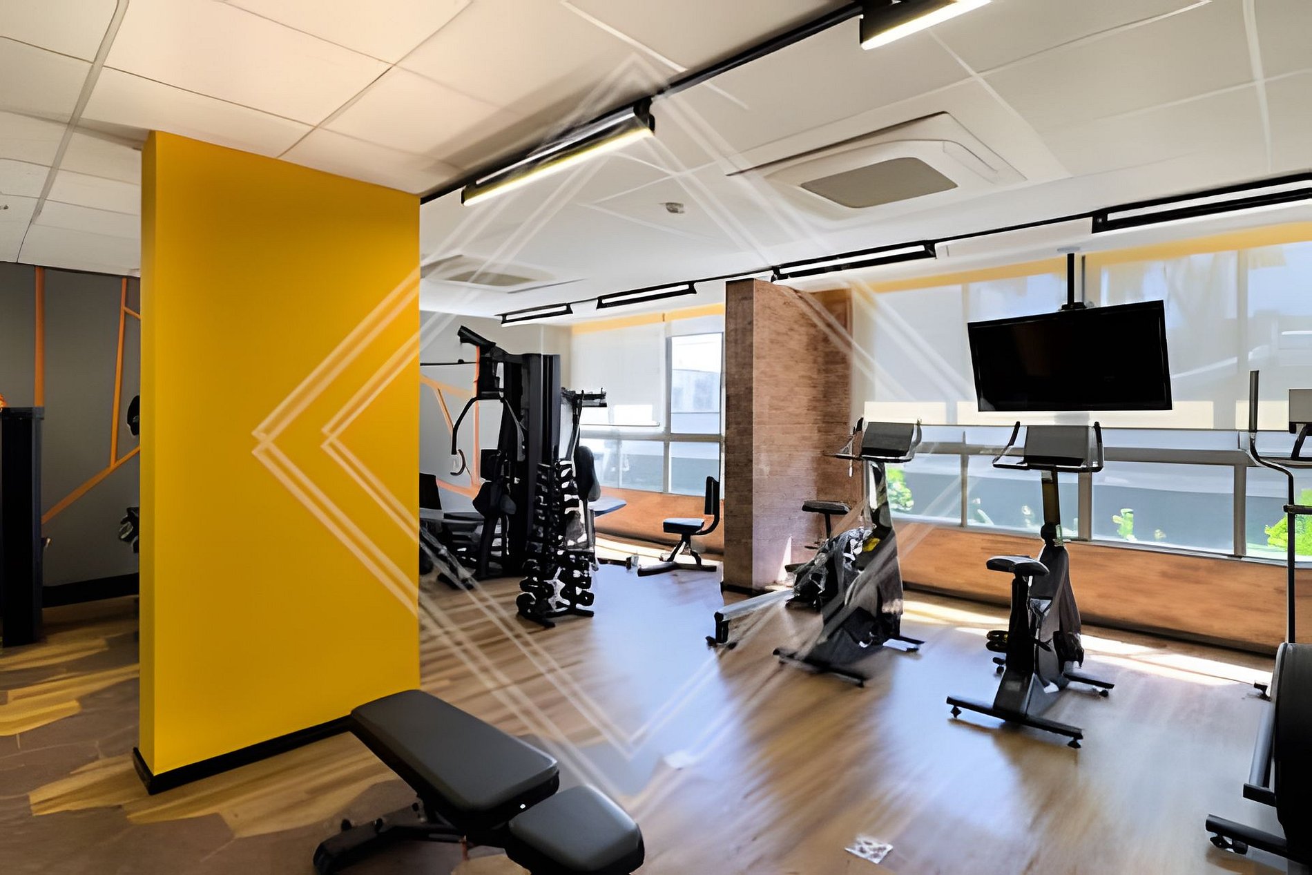 - Academia moderna com equipamentos de ginástica.