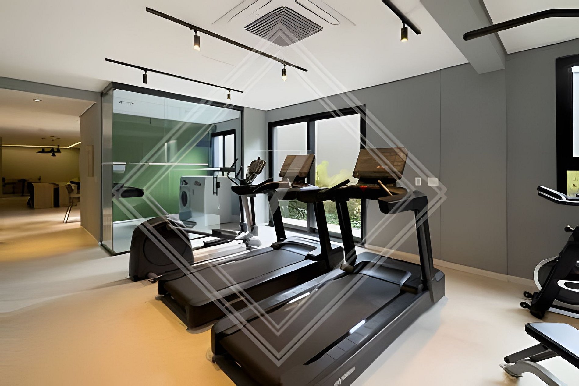 - Academia moderna com equipamentos de ginástica.