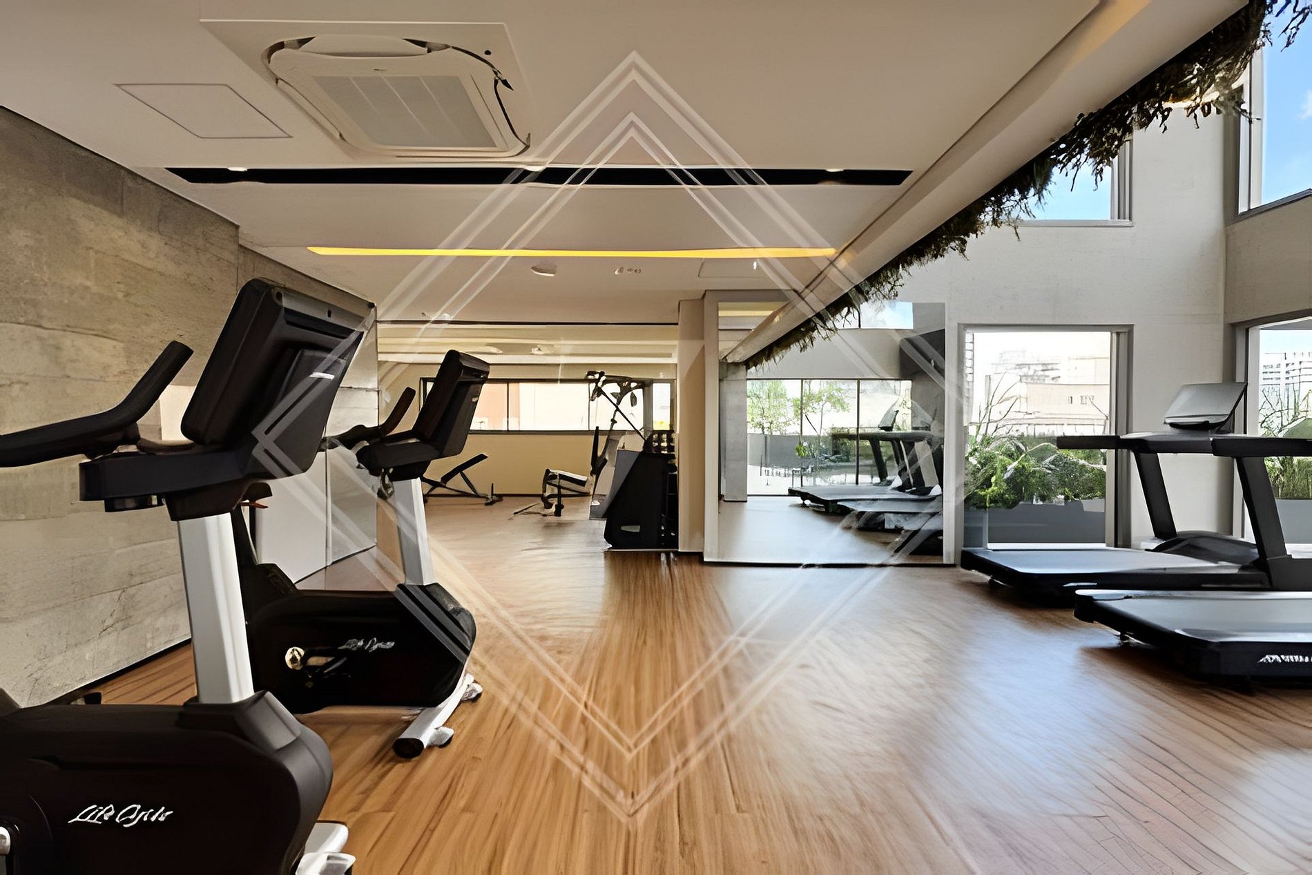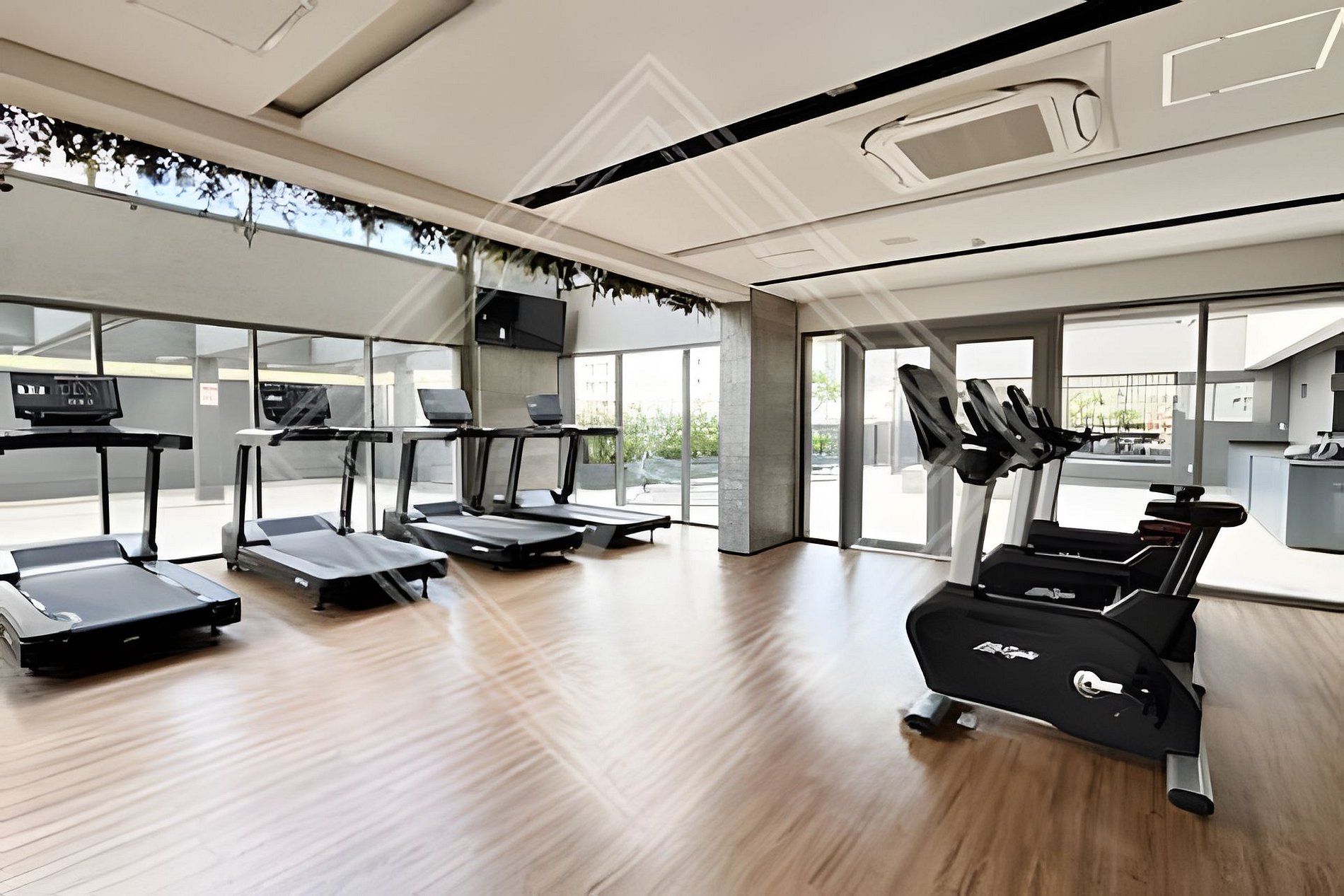 - Academia moderna com equipamentos de ginástica.