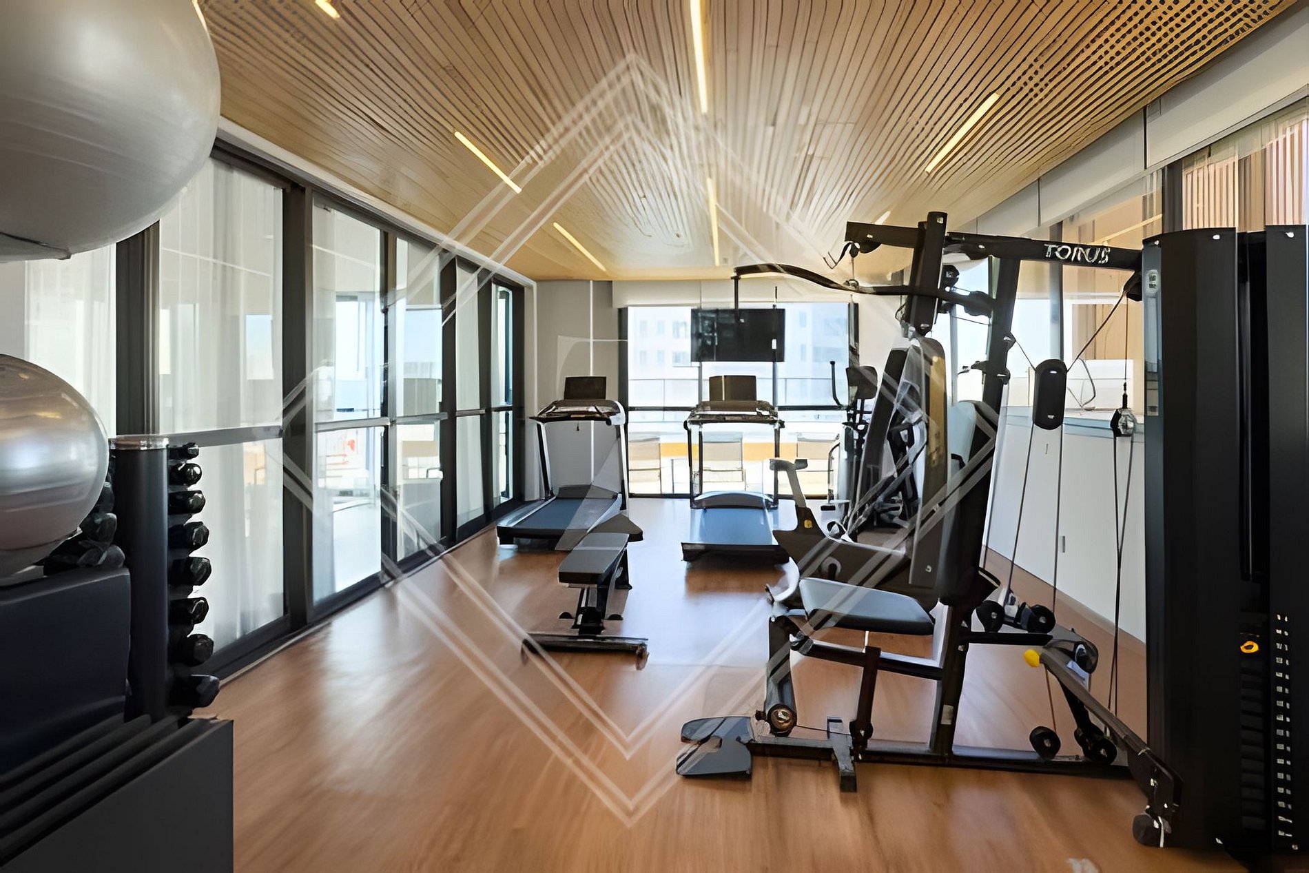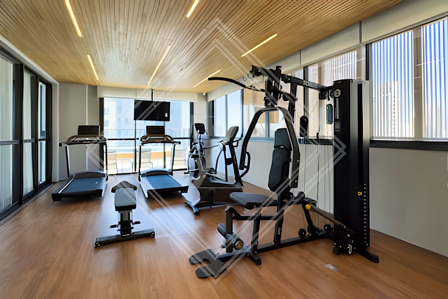 - Academia moderna com equipamentos de ginástica no rooftop.